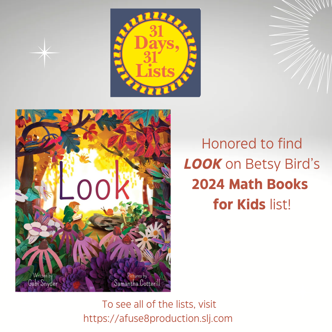 Honored to find LOOK, beautifully illustrated by Samantha Cotterill, on Betsy Bird’s 2024 Math Books for Kids list! Check out the full list here –https://afuse8production.slj.com/2024/12/10/31-days-31-lists-2024-math-books-for-kids/
