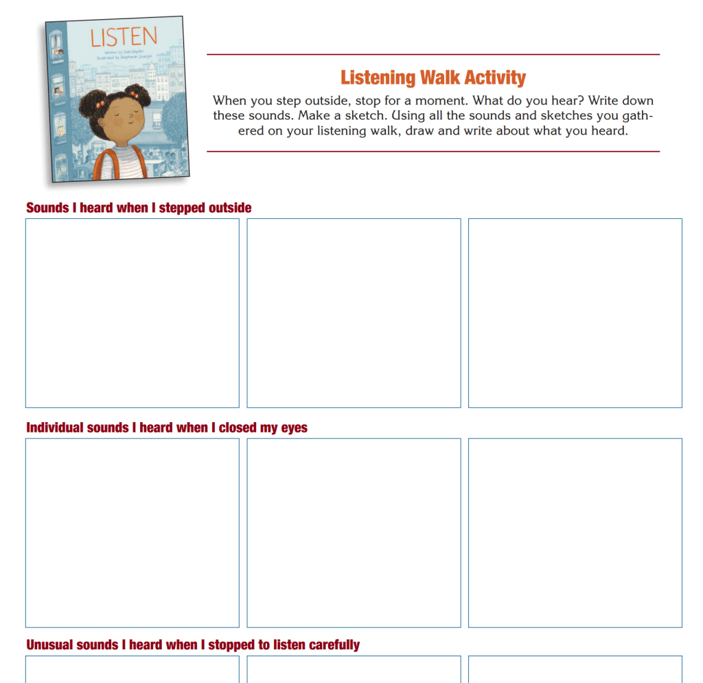 I’m thrilled to share the LISTEN curriculum guide, created by Simon & Schuster. The guide features six pages to further your discussion and activities around LISTEN, and includes reproducible activity sheets (see sample below). Click here for the downloadable guide.